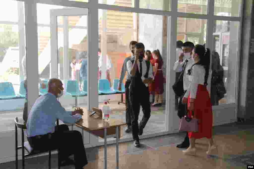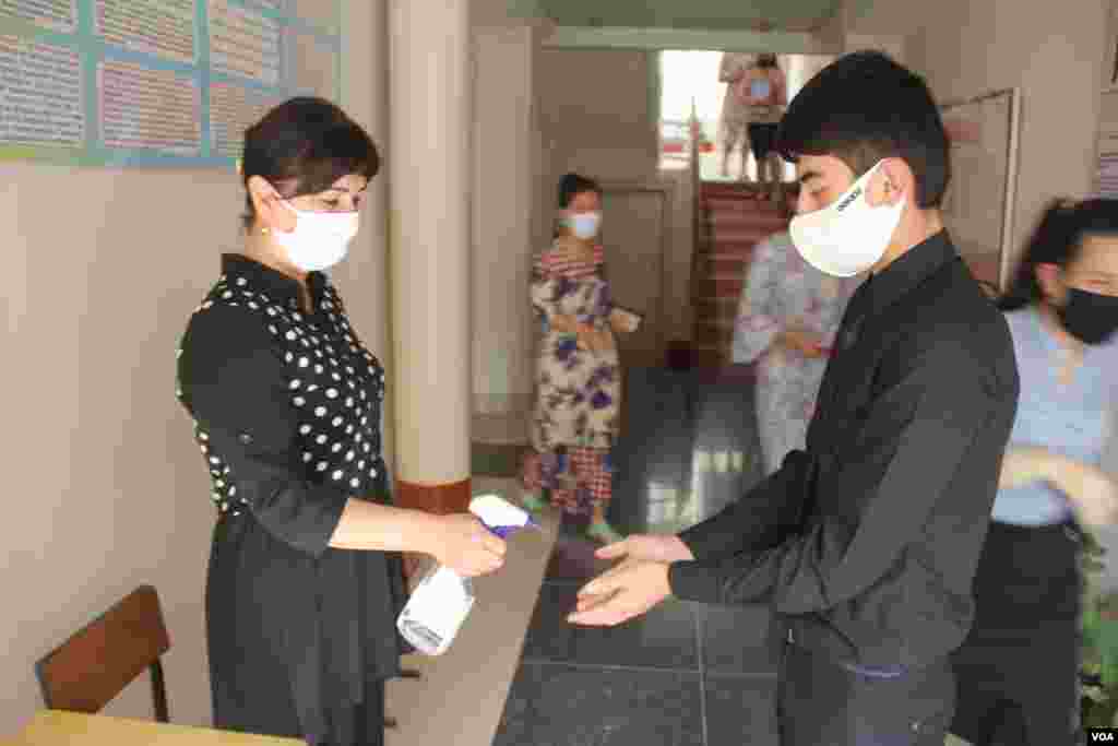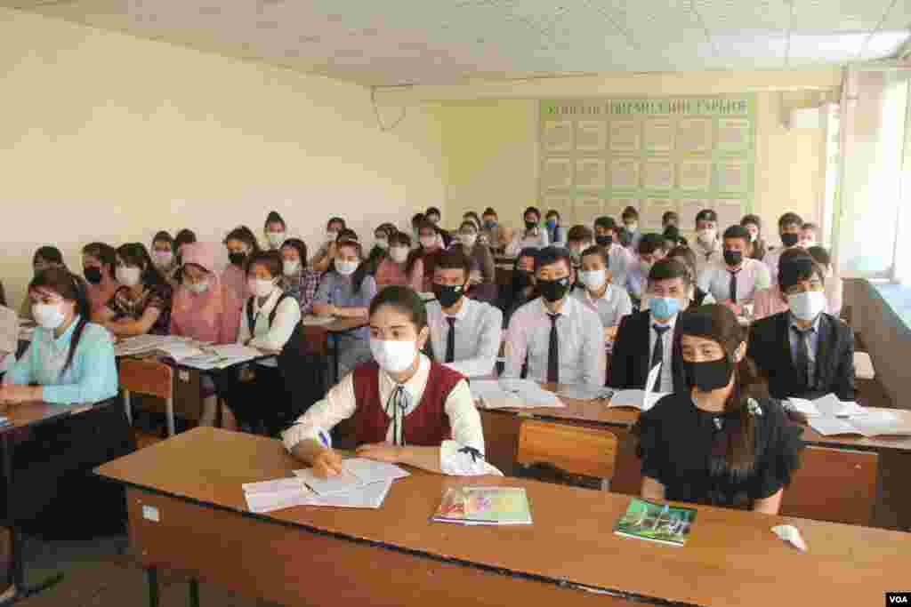 Tojikistonda talabalar yuzda niqob, qo’lda qo’lqop bilan oʻqimoqda