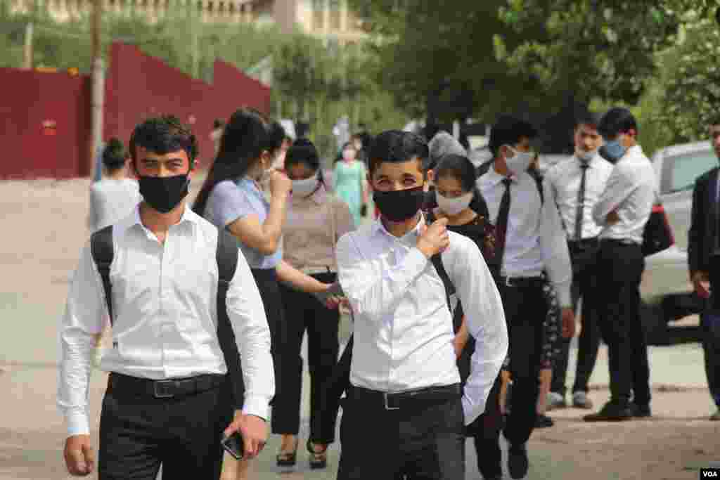 Tojikistonda talabalar yuzda niqob, qo’lda qo’lqop bilan oʻqimoqda