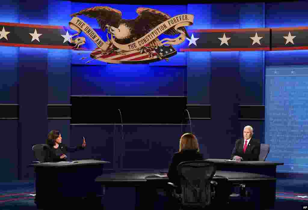 Democratic vice presidential nominee and Senator Kamala Harris speaks during the 2020 vice presidential debate with the Vice President Mike Pence at the University of Utah in Salt Lake City, Utah, Oct. 7, 2020.