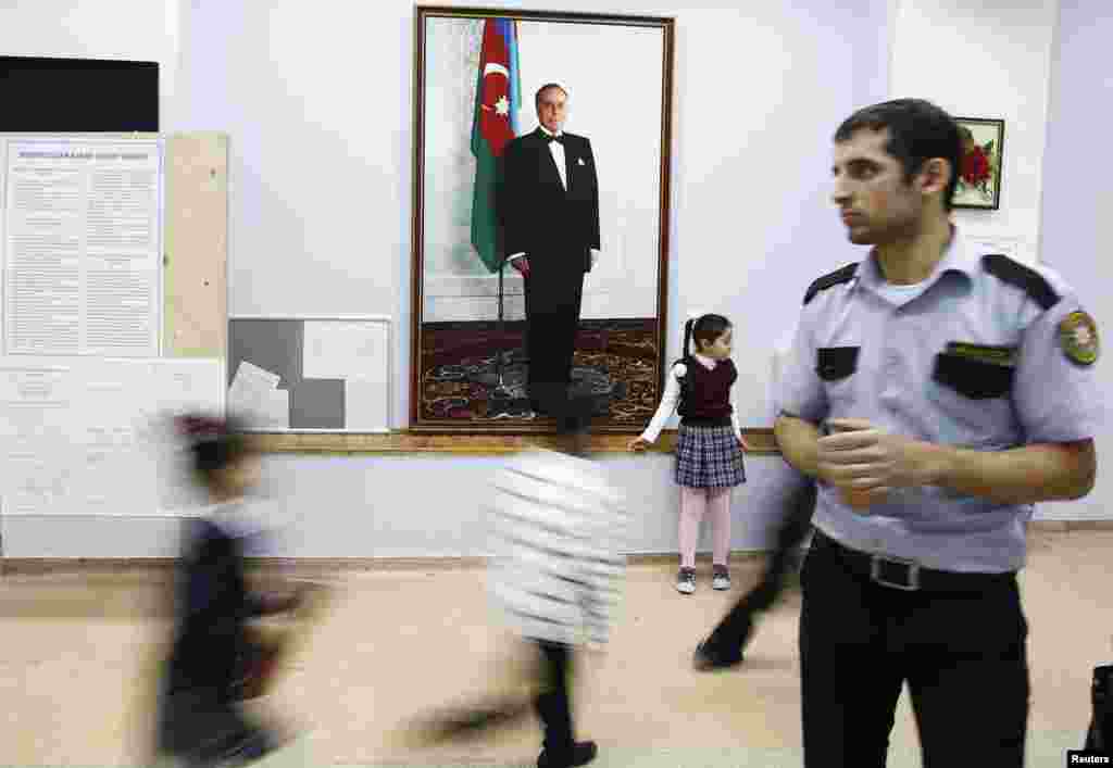 Prezident Ilhom Aliyev, rafiqasi Mehribon ovoz berayapti. Neftga boy Ozarbayjonda o'rtacha daromad oshib borayapti, bu esa Aliyevlar hukmronligini ta'minlovchi asosiy omil sanaladi.