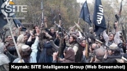 Suratlarda IShID jangarilari mushtlari va qurollarini ko'tarib turganini ko'rasiz.