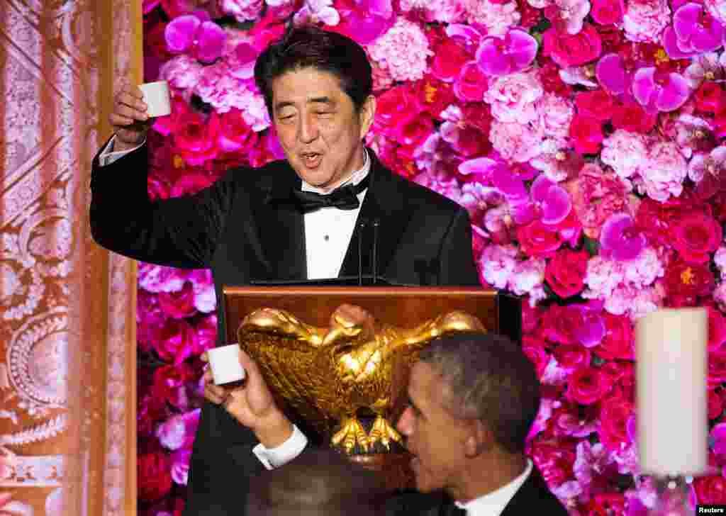 "Qo'shma Shtatlar Osiyo va Tinch okeani mintaqasidagi liderligini kuchaytirmoqda. Shinzo Abe Yaponiyani dunyo sahnasida yangi bosqichga olib chiqmoqda. Ikki davlat ittifoqi poydevori juda kuchli", - dedi Obama.
