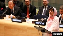 Malala Yusufzay, qizlar bilim olsin deya talab qilgani uchun Tolibon tomonidan o'qqa tutilgan o’smir, Nyu-Yorkda BMT qarorgohida Bosh Assambleya oldida nutq so'zladi.